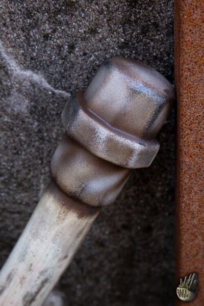 Dark Moon's White Pipe Sap ist eine 40 cm lange Latexpfeife, handbemalt, um wie Stahl auszusehen, mit einem abgenutzten, weißen Finish. Diese improvisierte kurze Waffe geht über ein einfaches Metallrohr hinaus, mit aufwendig geformten Details, die ihr ein realistisches Aussehen verleihen. Eine fein geformte Lauffläche ziert jedes Ende der Stange und eine 7 cm lange Außenkupplung ist wie ein kleiner Keulenkopf an der Oberseite angebracht. Bequemes, 12 cm langes Wildleder ist um die Unterseite gewickelt und bietet einen sicheren Halt, wenn der Steg zu dick ist.