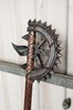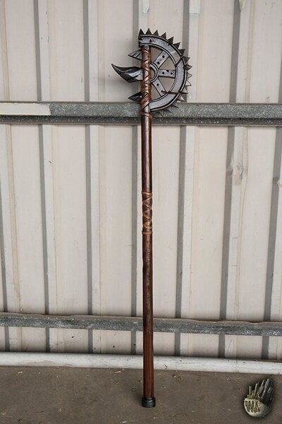 Dark Moon's Gear Axe ist eine robuste Latexwaffe, die für postapokalyptische Zeiten gemacht wurde. Die Zahnradaxt ist 155 cm lang und hat einen 115 cm langen Griff, der wie echtes Holz geformt und handbemalt ist. Der große Axtkopf ist so gestaltet, dass er wie ein Zahnradblatt mit einem Biss von 60 cm und 17 Zähnen aussieht. Auf der gegenüberliegenden Seite befinden sich drei Stacheln, nur für den Fall, dass das Getriebeblatt nicht gefährlich genug für dich ist.