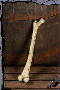 Mit einer Länge von rund 40 cm und der Form eines stilisierten menschlichen Oberschenkelknochens ist der Oberschenkelknochen eine ideale Balance zwischen Realismus und Theatralik. Die Oberfläche ist mit Texturen, Rissen, Grübchen und verwitterten Färbungen versehen, die ihr das Aussehen eines alten Knochens verleihen, der aus einem Grab oder Schlachtfeld gezogen wurde. Aus der Ferne könnte es das Auge täuschen. Aus der Nähe betrachtet ist es eine Requisite, aber eine, die dem Test der Zeit standhalten wird.