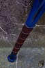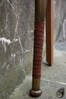 Dieser 80 cm lange Stacheldrahtschläger hat einen 17 cm langen Griff, der mit weichem Spaltleder umwickelt ist, und verfügt am Ende über den typischen Baseballschläger-Knauf. Der Rest der Fledermaus ist handbemalt blau mit verblasster Farbe, mit metallischen Drahtsträngen und flexiblen Widerhaken am Ende.
