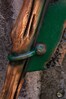 Dieser 97 cm lange Buschhaken hat einen 56 cm langen Griff, der handbemalt und geschnitzt ist, um wie Holzmaserung auszusehen. Er ist an einem langen, axtartigen Kopf mit einem gebogenen Haken befestigt. Der 39 cm lange Kopf wurde so bemalt, dass er wie rot lackiertes Metall mit verrosteten und abgenutzten Kanten aussieht.