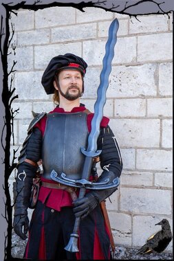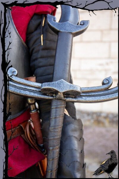 Die Landsknechte Flamberge ist ein durchdacht gestaltetes Großschwert, das von den ikonischen Waffen der Landsknechte inspiriert ist. Diese 150 cm lange Waffe ist vollständig aus Schaumstoff gefertigt und verfügt über eine Klinge im Flamberge-Stil mit subtilen, wellenartigen Kurven, die ihre Ästhetik verbessern und das historische Design widerspiegeln. Der Griff mit seinem stahlfarbenen Handschutz und Knauf spiegelt das traditionelle Aussehen von Landsknechtenschwertern wider und vermittelt ein Gefühl von Authentizität. Der Griff ist mit schwarzem Leder umwickelt und bietet während des Gebrauchs einen bequemen und sicheren Halt. Egal, ob Sie an LARP-Kämpfen teilnehmen oder es als Teil einer Sammlung ausstellen, das Landsknechte-Flamberge verbindet historischen Einfluss mit praktischem Design und ist damit eine vielseitige Ergänzung für das Arsenal jedes Enthusiasten.