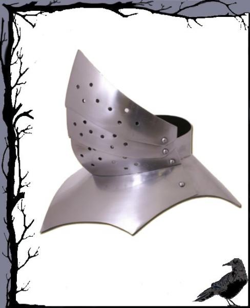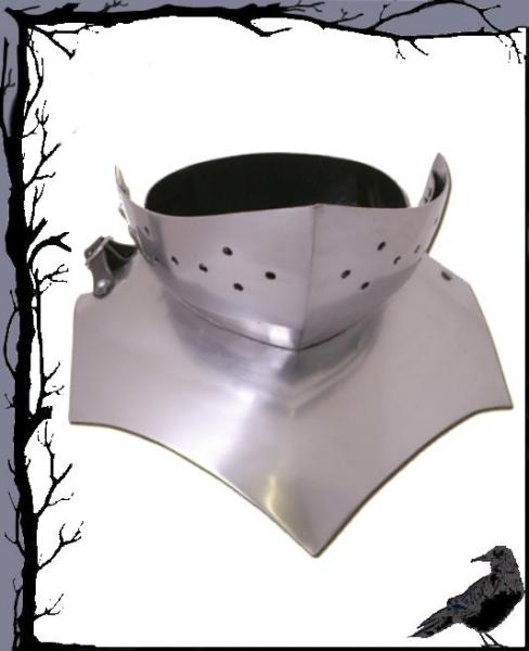 Hergestellt aus 1,6mm starkem Stahl. Zur Halsberge gehört die Rückenplatte, welche auf einer Seite mithilfe von eines Riemen mit Schnallen größenjustierbar befestigt ist. Der dreiteilige Kinnschutz ist verstellbar.