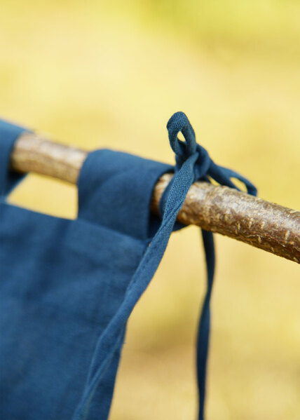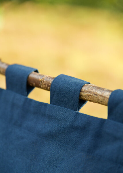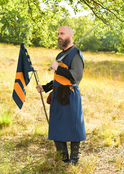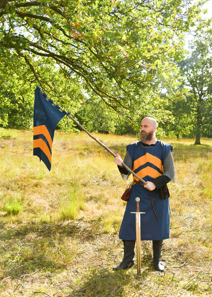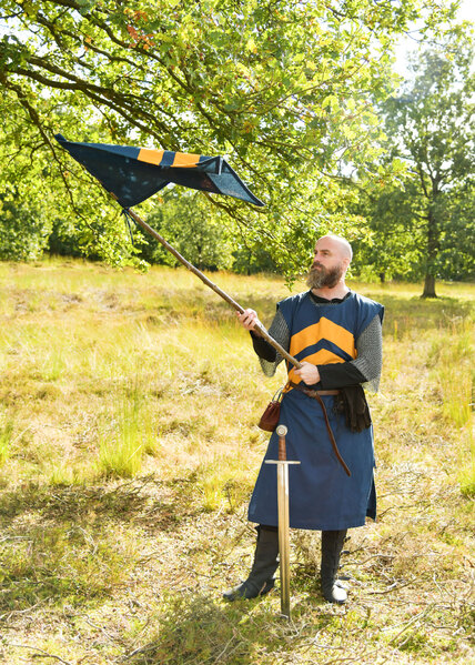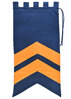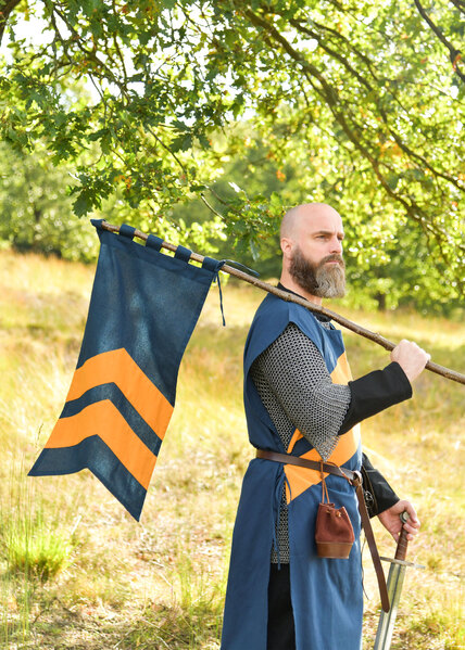 Diese zweifarbige Fahne ist aus Baumwollstoff gefertigt. Die am oberen Rand der Fahne befestigten Schlaufen haben eine Länge von 5cm und können über eine Stange gezogen werden. Mit einem kleinen Bändchen wird das untere Ende an der Stange festgeknotet. Der applizierte gelbe Stoff in Pfeilform auf blauem Grund hat einen hohen Wiedererkennungswert und ist farblich auf den Wappenrock  Artikel-Nr: 12112-5 abgestimmt.