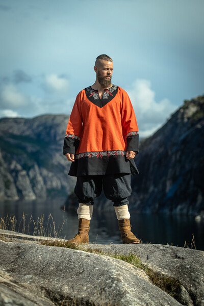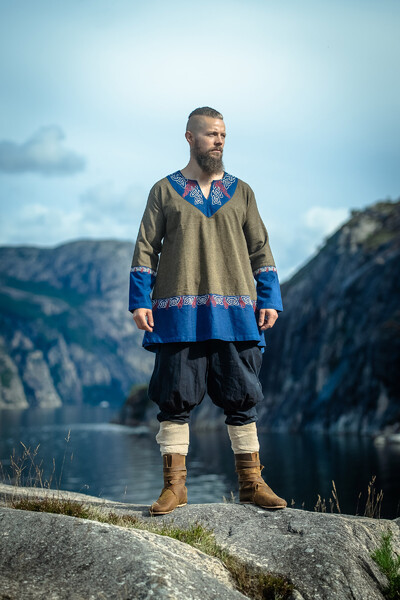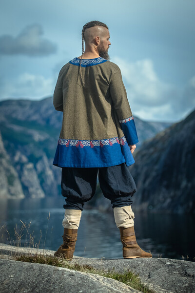 Die Wikinger Tunika Freydis ist mehr als nur ein Kleidungsstück, es ist ein Statement. Mit ihrer aufwändigen Handstickerei im Hals-, Ärmel- und Saumbereich zieht sie alle Blicke auf sich und lässt Dich in die Welt der Wikinger eintauchen. Das einzigartige Muster, verleiht jeder Tunika ihren besonderen Charakter. Der weit ausgestellte Schnitt sorgt für ein dramatisches Erscheinungsbild, während die detailverliebte Verarbeitung höchste Qualität verspricht. Diese Tunika reicht bis zu den Knien und bietet dank des lockeren Fits einen hohen Tragekomfort.