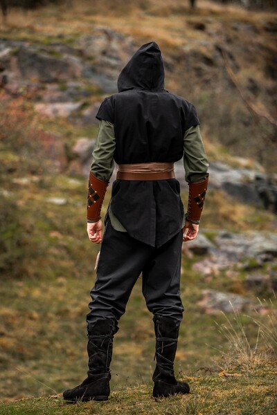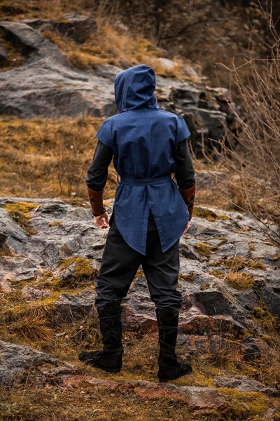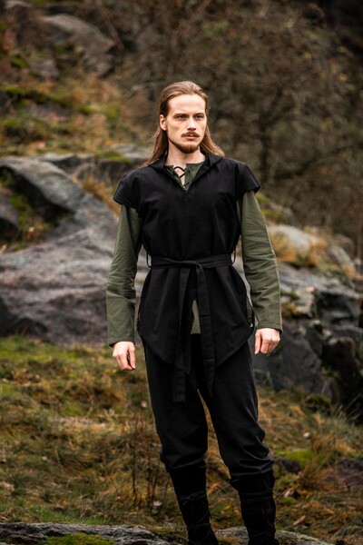 Die Waldläufer Tunika Arais ist mehr als nur ein Kleidungsstück, sie ist ein Tor zu deinen epischen Abenteuern. Inspiriert von historischen Designs, bietet diese Tunika mit ihrer Kapuze und einem V-Ausschnitt eine unvergleichliche Mischung aus Komfort und Stil. Sie ist ärmellos und bedeckt elegant die Schultern. Ein ca. 32 cm langer Schlitz vorne sorgt für Bewegungsfreiheit, während der gleichfarbige Stoffgürtel, der durch zwei seitliche Laschen gezogen wird, eine individuelle Anpassung ermöglicht. Diese Tunika passt sich perfekt an deine Bedürfnisse an und begleitet dich auf all deinen Reisen.