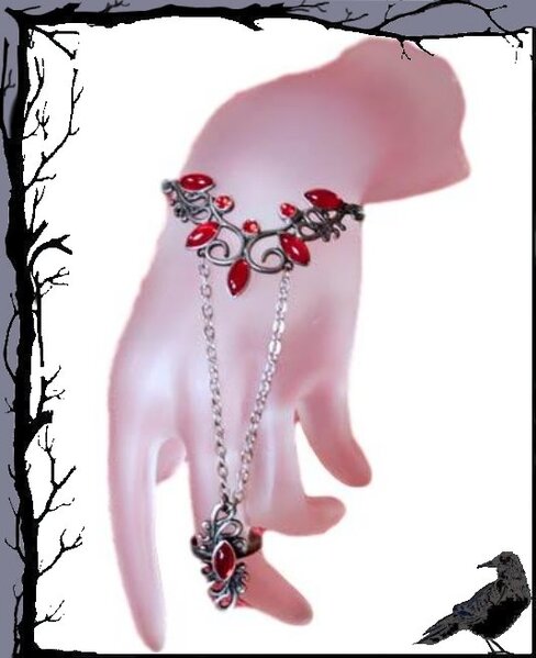 Zeitgemäße Handkette für Mittelalterliches Volk, Hexen und die Fantasyszene. Diese Handkette kann mittels einer verstellbaren Kette geschlossen werden und kann sich dadurch an die Hand angepasst werden. Die Handkette ist mit Glassteinen verziert.