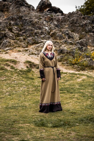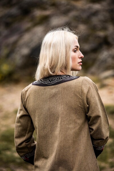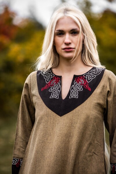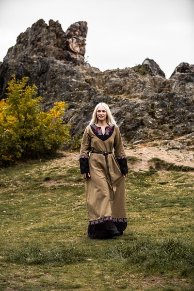 Dieses Kleid ist von den historischen Designs inspiriert, die im Alltag der Wikingerfrauen zu finden waren. Die Stickereien erinnern an die kunstvollen Muster, die in vielen archäologischen Funden aus Skandinavien entdeckt wurden. Diese Verzierungen dienten nicht nur als ästhetisches Element, sondern hatten oft auch symbolische Bedeutungen. Unser Idun Kleid ermöglicht es Dir, Dich mit dieser faszinierenden Welt zu verbinden und ihre Geschichten nachzuerleben.