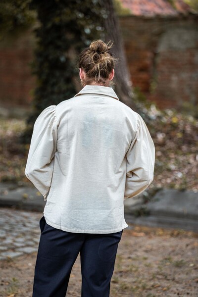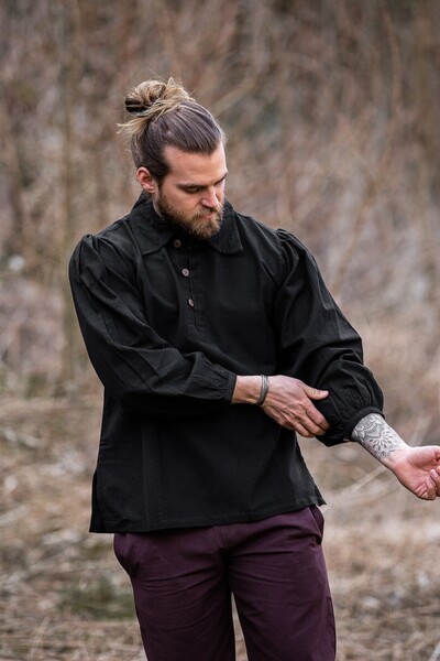 Tritt ein in die Welt des Mittelalters mit unserem einzigartigen Mittelalterhemd Ferdinand. Dieses meisterhaft gestaltete Hemd besticht durch sein lockeres Design, das Komfort und Bewegungsfreiheit vereint. Die langen Ärmel sind an den Manschetten gerafft und mit Knöpfen versehen, während der flache Kragen und die Knopfleiste vorne einen klassischen Look bieten. Der gerade Saum endet auf Hüfthöhe und sorgt für eine schlichte, aber markante Silhouette. Lass dich von der hochwertigen Verarbeitung inspirieren, die sich auf Form und Konstruktion konzentriert.