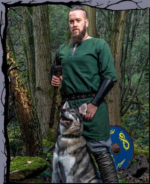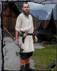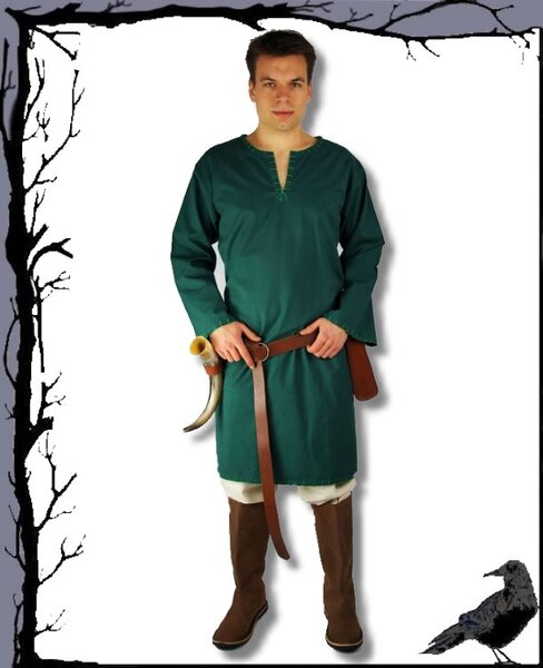 Schöne Wikingertunika mit geschlitzten Dekollete, verzierter Naht an den Säumen und langen Ärmeln aus Baumwolle.