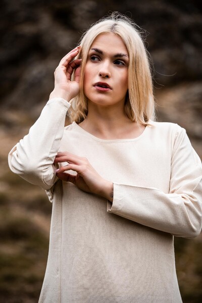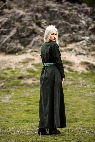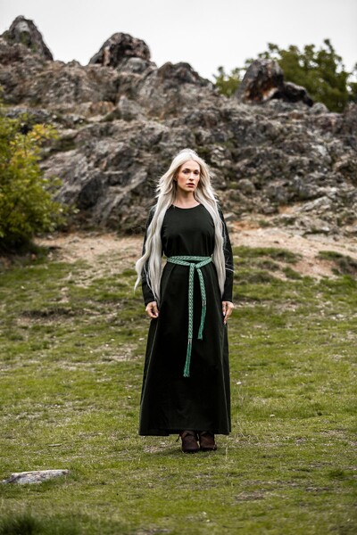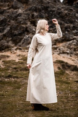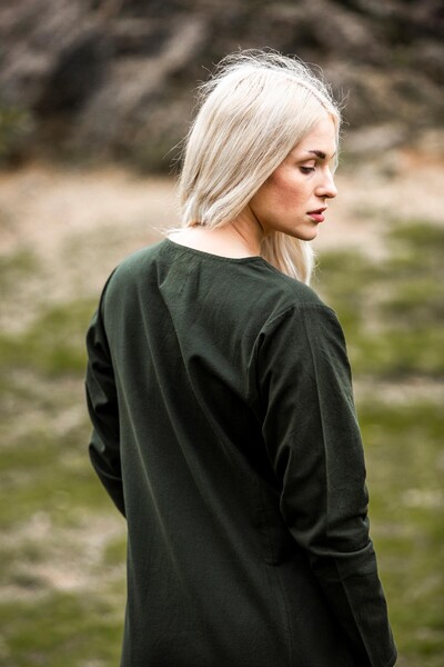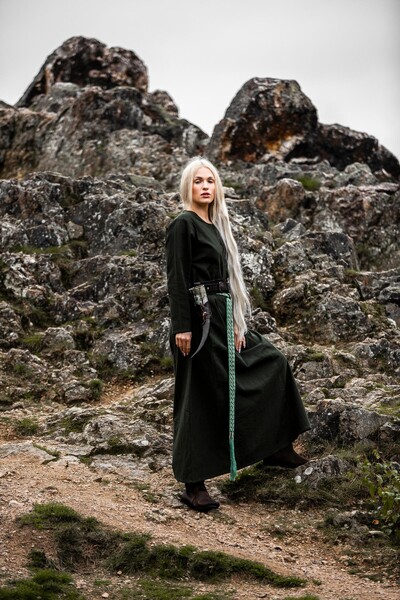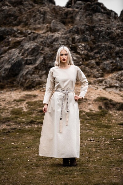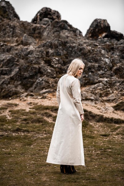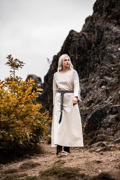 Unser Kleid Alvilda ist inspiriert von der schlichten Schönheit mittelalterlicher Gewänder, die Frauen in einer Zeit trugen, in der Eleganz und Funktionalität Hand in Hand gingen. Diese Kleider waren bekannt für ihren praktischen Nutzen und ihre anmutige Erscheinung, ideal für jede Frau, die sich im Alltag frei bewegen wollte. Durch seine gewebte Struktur und das Fehlen eines Kragens bleibt das Kleid dem minimalistischen Stil treu, der so typisch für das Mittelalter war.