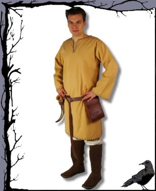 Schöne Wikingertunika mit geschlitzten Dekollete, verzierter Naht an den Säumen und langen Ärmeln aus Baumwolle.